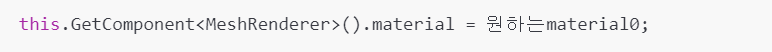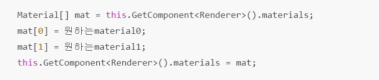 GetComponent<MeshRenderer>().material이 의미하는 바가 materials가 여러 개더라도 항상 첫 material element를 의미하기에 이 코드가 가능하다. material[1],material[2], ...를 바꾸고 싶을때는 방법1, 방법2의 방법을 사용해야 한다.