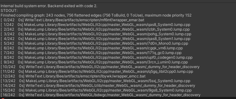 UnityEditor.WebGL.WebGlBuildPostprocessor.PostProcess (UnityEditor.Modules.BuildPostProcessArgs args) (at /Users/bokken/buildslave/unity/build/PlatformDependent/WebGL/Extensions/Unity.WebGL.extensions/BuildPostprocessor.cs:158)