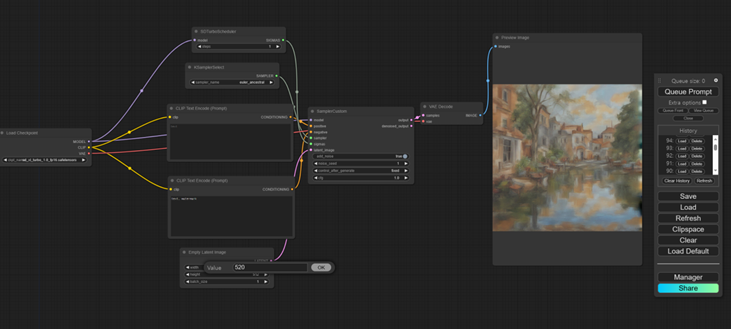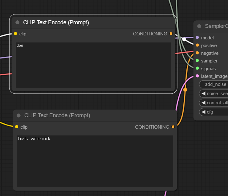 - 위 Prompt 노드에는 positive prompt를, 아래 Prompt 노드에는 negative prompt를 적어준다. 우측에 SamplerCustom노드의 positive와 negative가 각각 연결되어있는걸 확인해볼 수 있다.