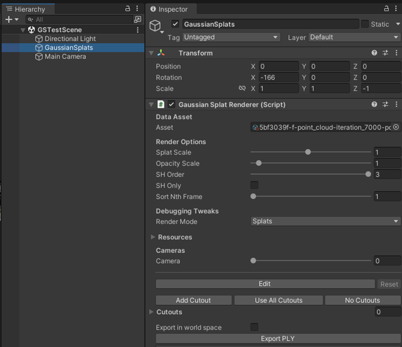 6. GSTestScene을 열고, 하이어라키창의 GaussianSplats오브젝트의 Inspector를 확인합니다.