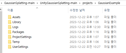 2. GaussianSplatting-main\UnityGaussianSplatting-main\projects\GaussianExample을 Unity 2022버전이상에서 열어줍니다. (2021버전에서 해보았는데, 버전이 맞지 않아 에러가 발생합니다.)