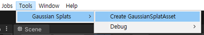 3. Tools> Gaussian Splats > Create GaussianSplatAsset을 눌러, Gaussian Splat Creator창을 눌러줍니다.