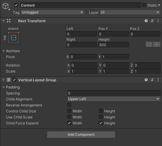 수직정렬이기 때문에 Scroll View의 Content object(위 사진에 표시되어 있는 곳)에 Vertical Layout Group 컴포넌트를 추가한다. 그럼 다음과 같다.