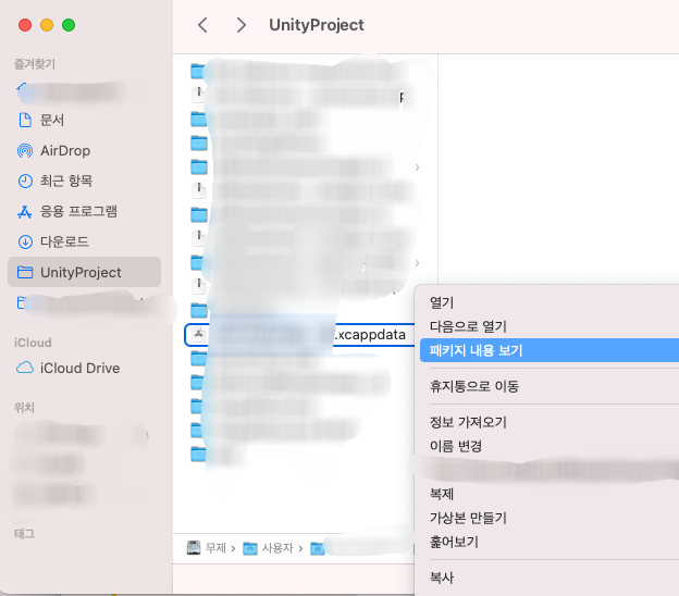 2. 다운 받은 xcappdata 오른쪽 클릭 -> 패키지내용보기