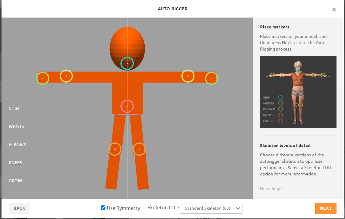 믹사모에서 upload character를 하면 다음과 같은 화면이 나오고 next를 누르면 턱,팔목,다리 등 뼈대를 옆의 예시와 같이 잡아줍니다.